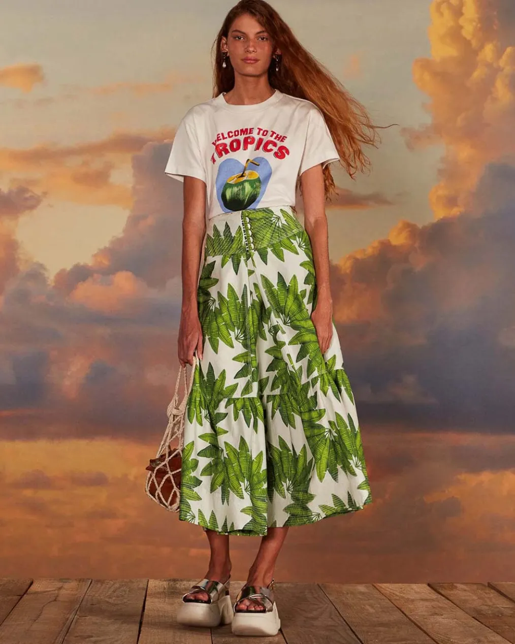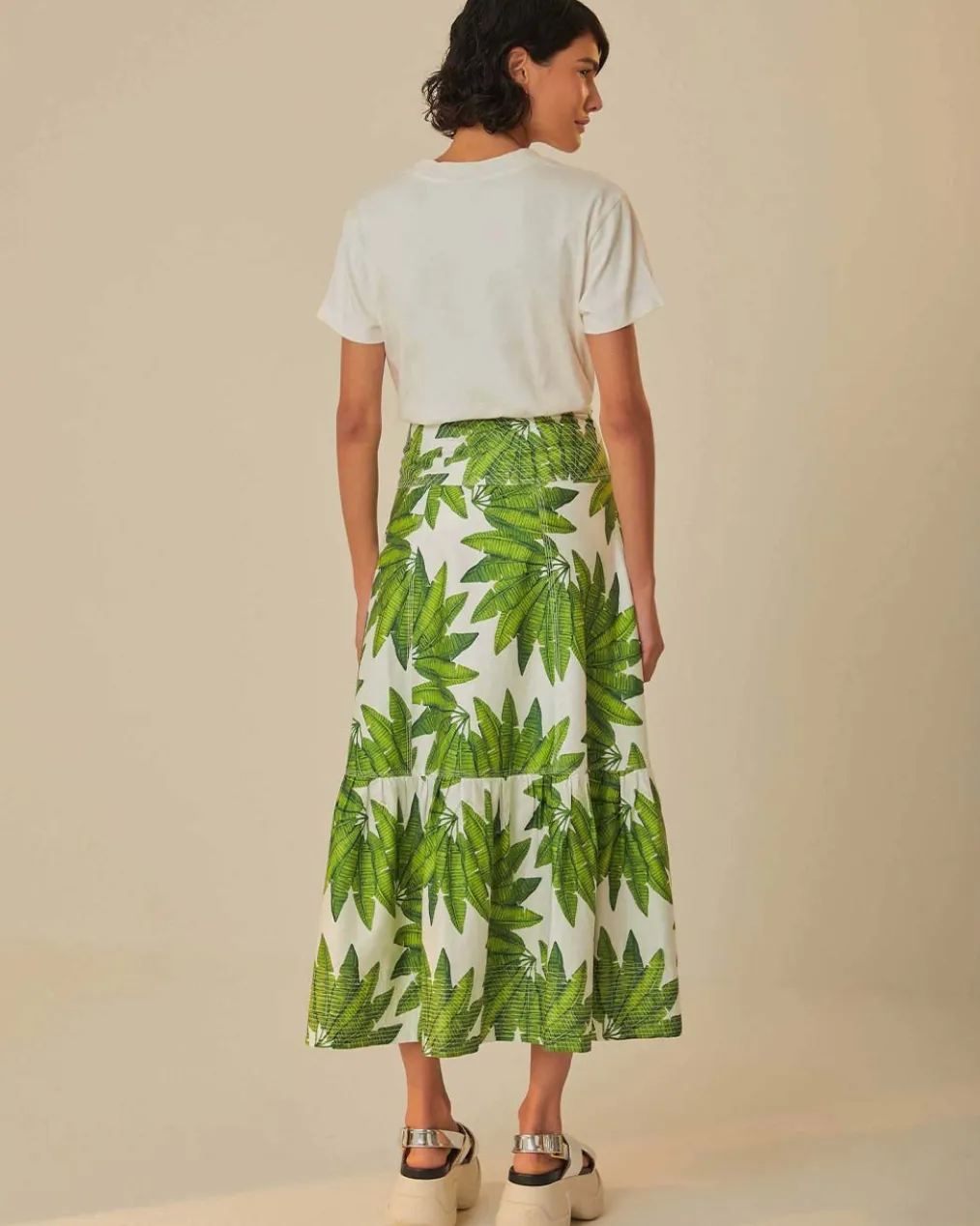 Embrace the tropical vibe with the Off-White Palm Fan Organic Cotton Maxi Skirt, a playful yet elegant piece perfect for sunny escapades. Crafted from organic cotton, this skirt flourishes with a vibrant green palm fan print set against a serene off-white backdrop. The flattering high-waist cut and gentle flow of the fabric create a beautiful silhouette, ensuring a comfortable fit while you make a breezy statement. This eye-catching design promises to be the center of attention at any gathering or day out. 100% Certified Organic Cotton: GOTS-certified organic cotton has a lower environmental impact than conventional cotton, as it reduces water usage, greenhouse gas emissions, and the amount of chemicals used.