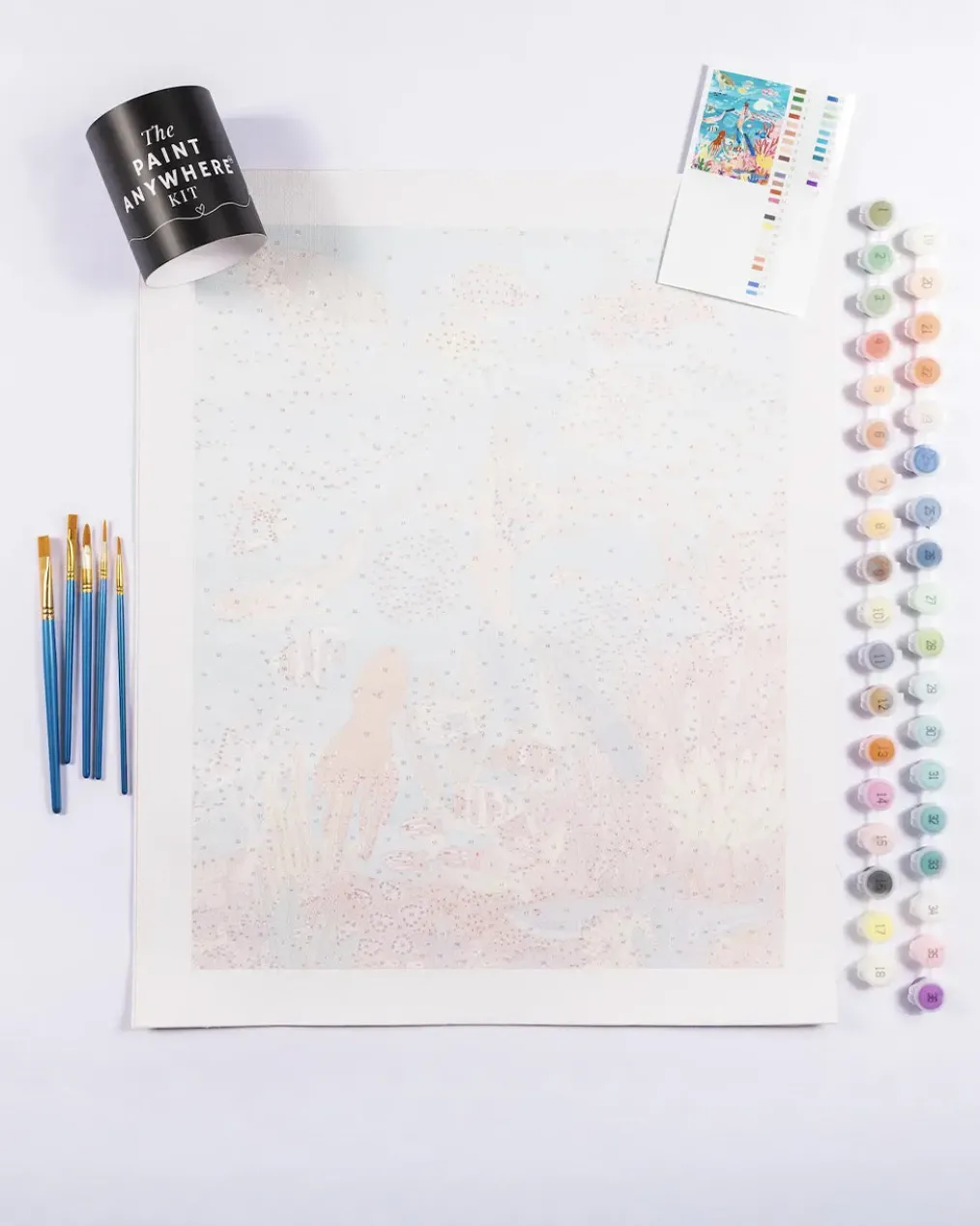 - Includes: 16 in. x 20 in. ready-to-paint premium printed canvas, a 5 brush set, and 36 handy little pots of acrylic paint