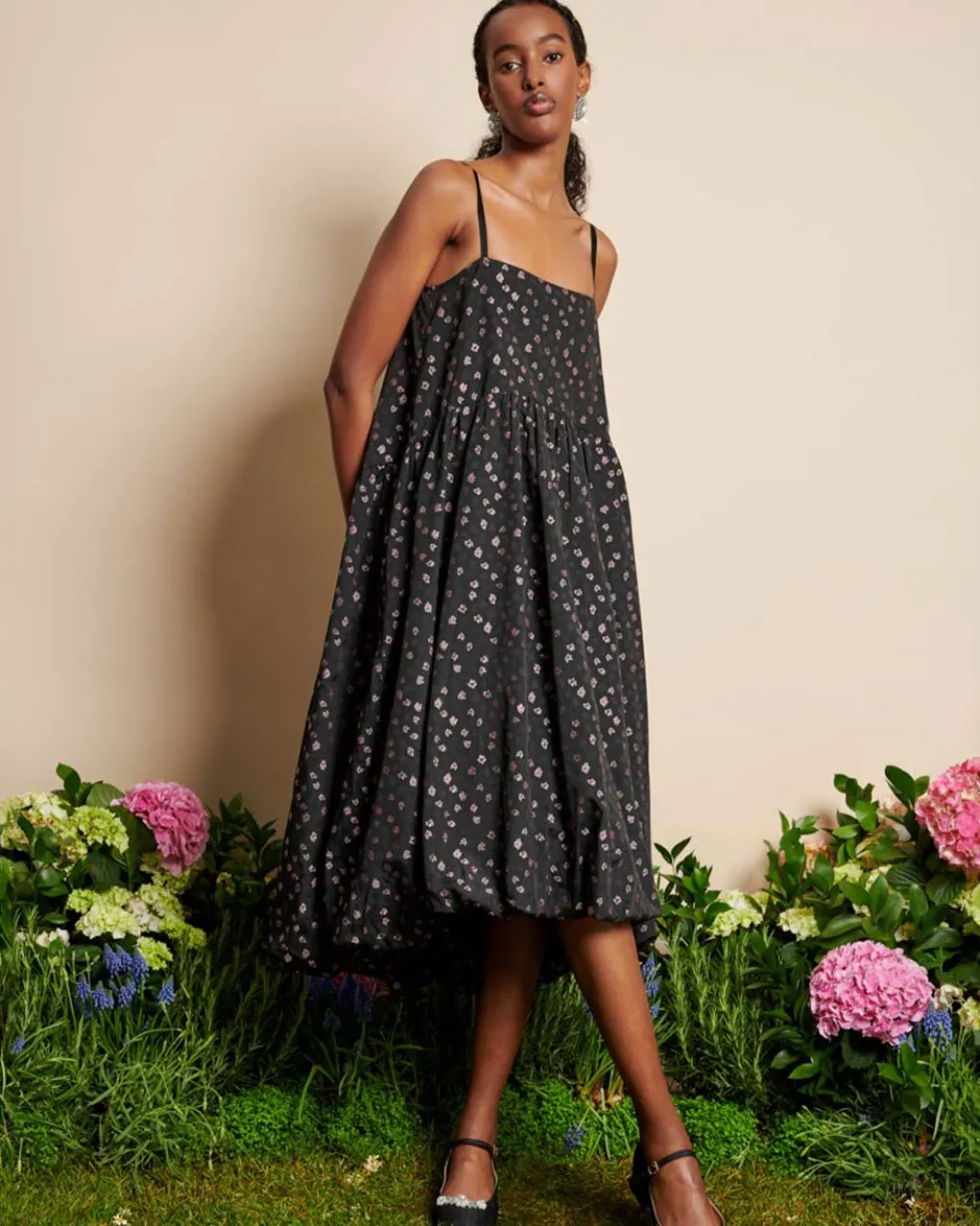 - A loose-fit midi dress in a ditsy floral jacquard fabric.