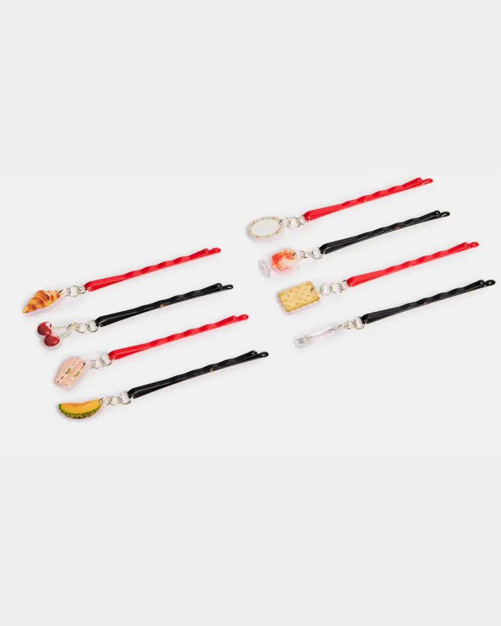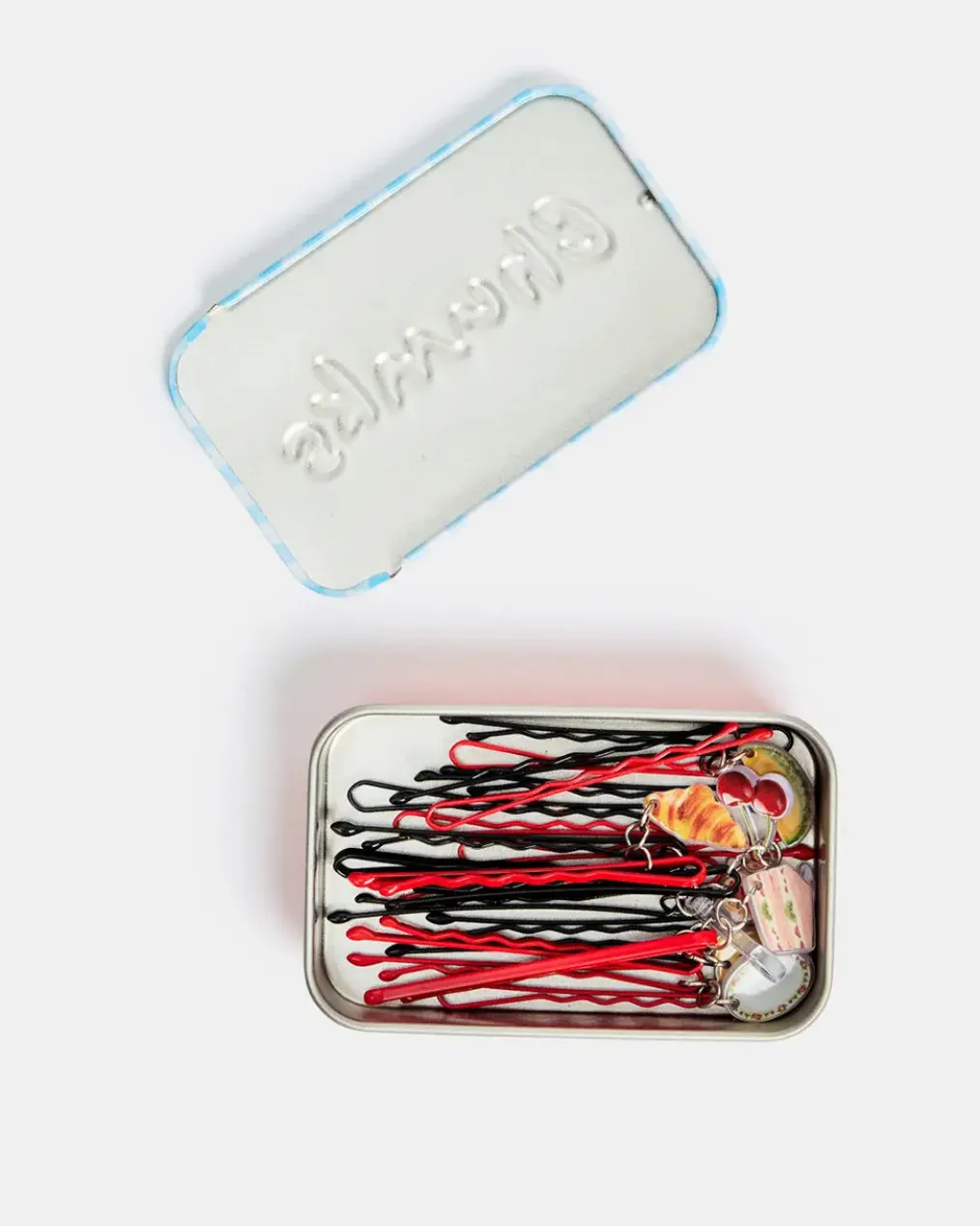 A set of 20 black and red, enamel-coated bobby pins and 8 picnic-themed acetate charms. Comes in a colorful, reusable metal tin.