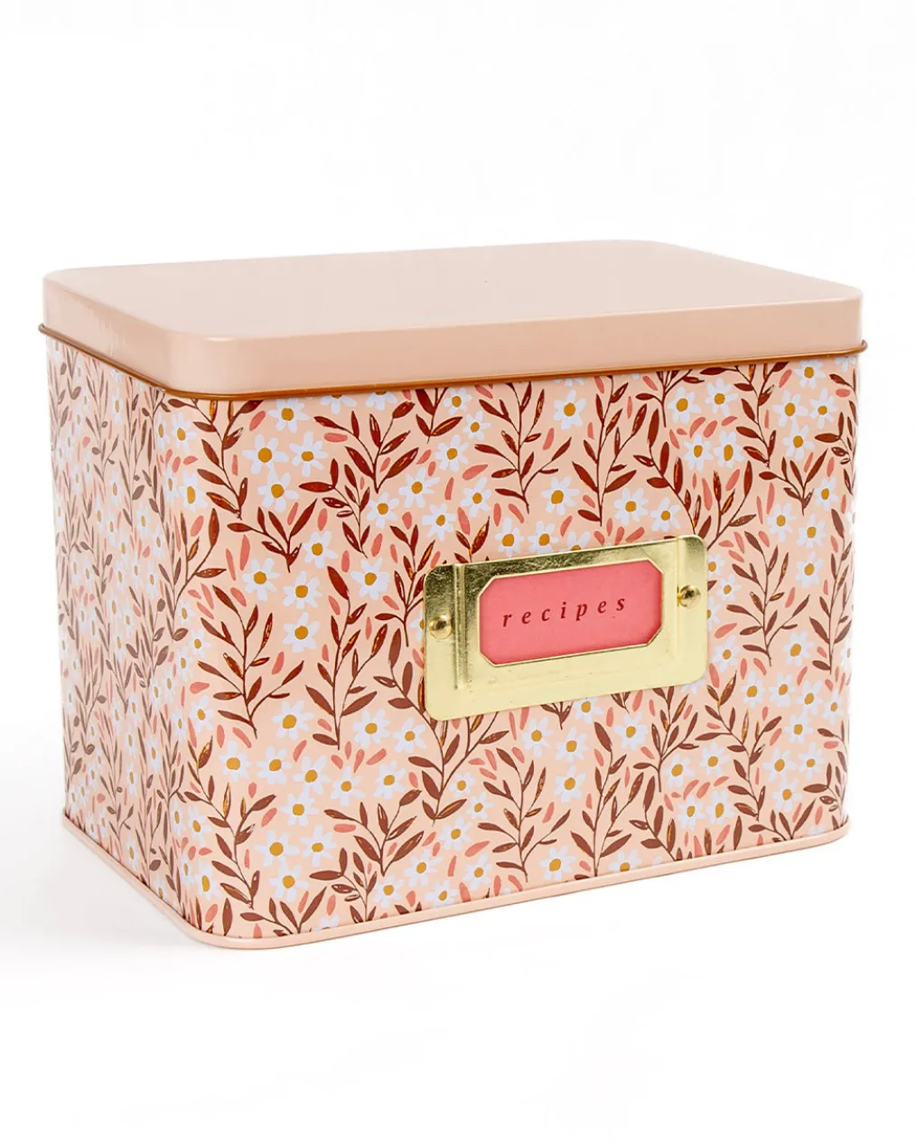 - Features: Hinged lid, metal bookplate on front, includes 15 Pink Daisy Recipe Cards and 1 pack of Dark Herringbone Recipe Divider Tabs
