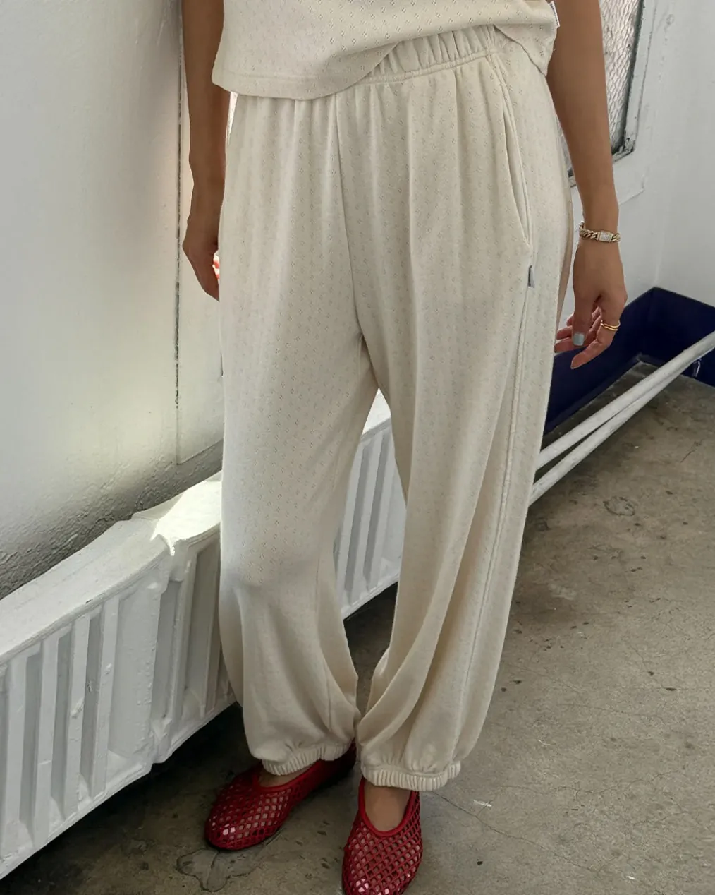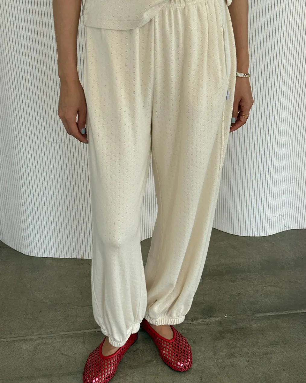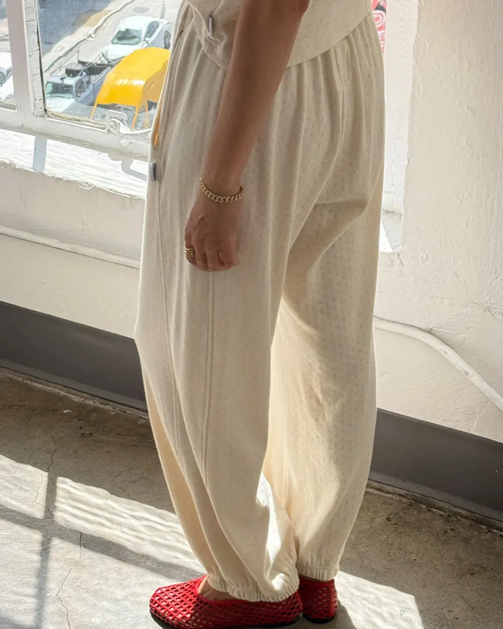 The iconic Balloon Pant silhouette just got cozier. Made from the same ultra-soft cotton pointelle jersey as the Eve Cami—dreamy to the touch with a gentle drape. Designed with an easy elastic high waist, relaxed fit, and gathered ankles that play well with any shoe, they’re finished with slimming side panels and hidden slit pockets for just the right balance of comfort and structure. Whether you’re lounging, layering, or stepping out, these pants were made to move with you.