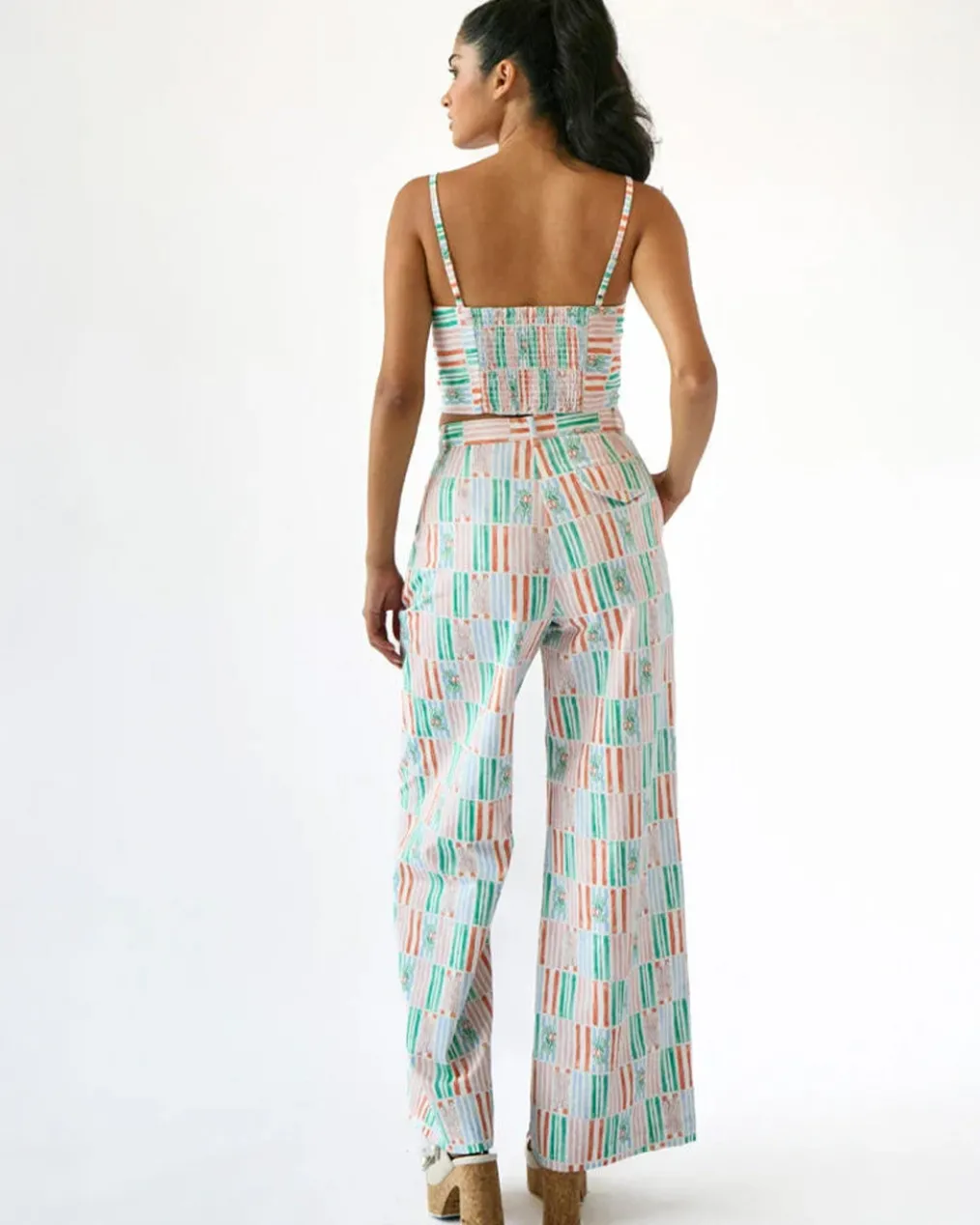 Dress like a seagull’s POV, in Rose! On Rachel Antonoff’s newest spring pant, birds-eye beach chairs bask on a plain of 100% cotton twill. While sadly bereft of delicious trash, Rose offers a wide-leg, high-waisted silhouette and flattering little front pleats. Toss on over a bikini for an instant put-together beach look, or go full gull by pairing with the Keller top and stealing your date’s fries.