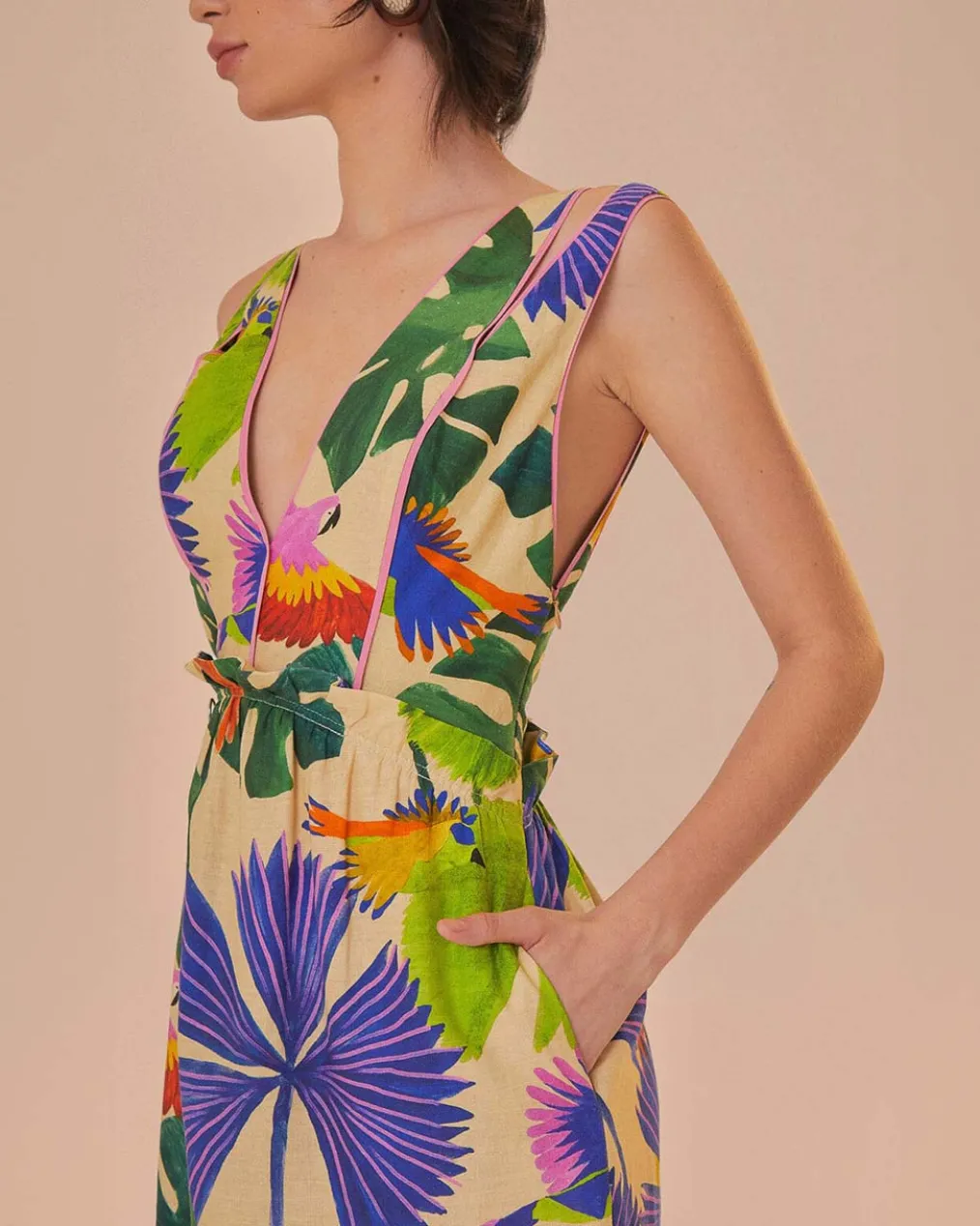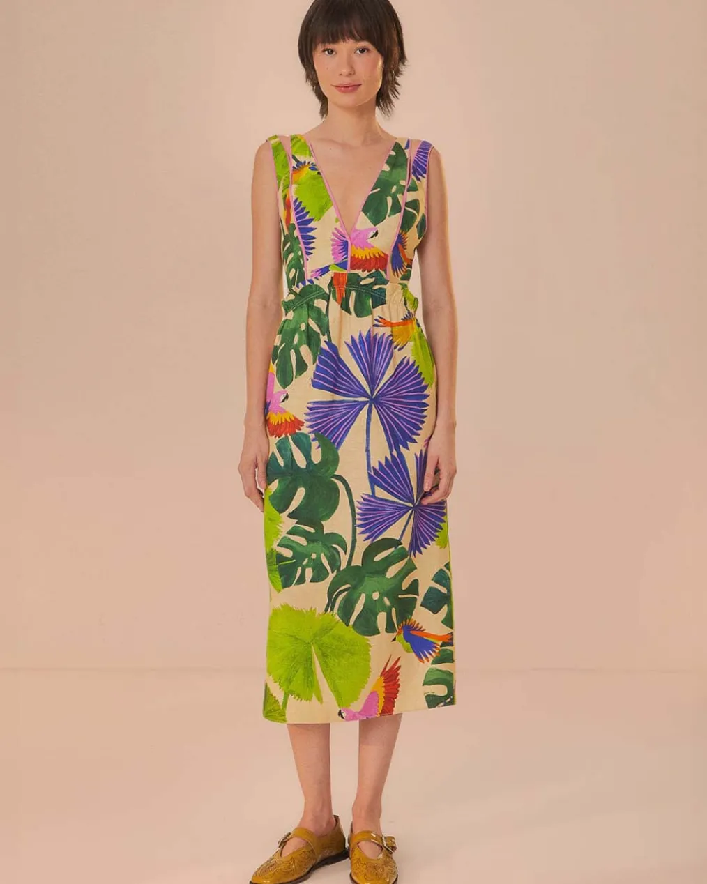 Embrace the vibrant energy of Brazilian forests with the Macaw Jungle Sand V Neckline Midi Dress. The flattering V neckline complements the flowy silhouette, while a lush print of tropical leaves and macaw parrots dance across the fabric. Earthy sand-hued backdrop sets the stage for dazzling purples, greens, and bursts of sunset orange. This enchanting midi dress is a canvas that celebrates the spirit of nature’s artistry.