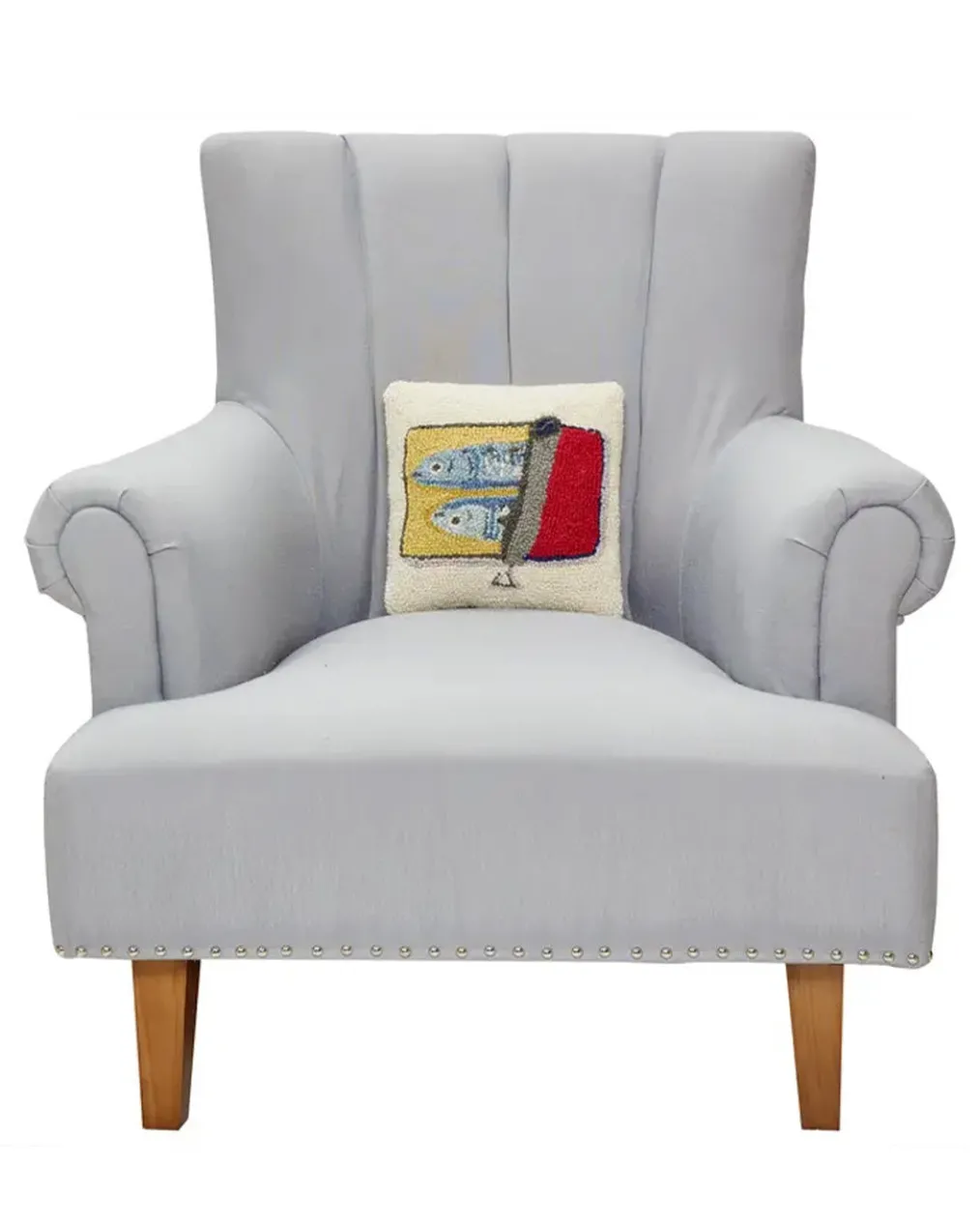 Cuddle up cozy and tight with this adorable hooked wool sardines in a can pillow. A fun and whimsical addition to any interior, the sardines pillow will bring a smile to any tinned fish lovers face!