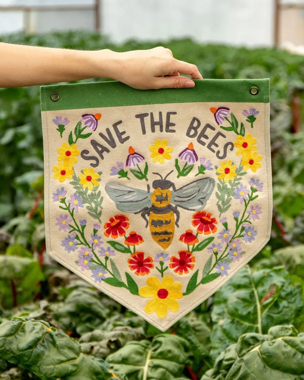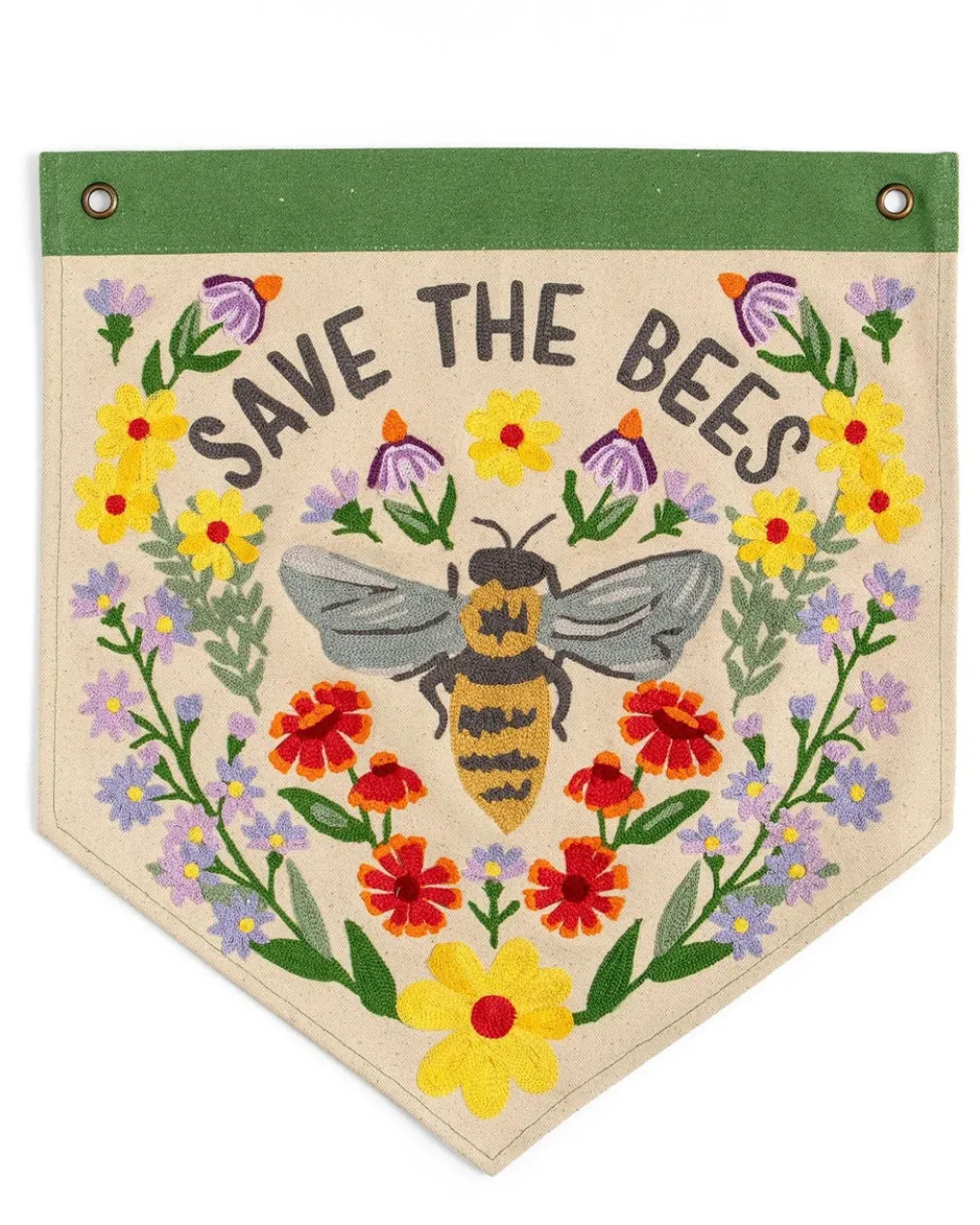 Elevate your space with the Save The Bees Embroidered Canvas Banner. This hand-illustrated, visually striking flag is perfect for bee enthusiasts, flower fans, and nature lovers. Featuring intricate chain-stitch embroidery, applique letters, and a canvas hem top edge, this home decor tapestry is sure to make a statement wherever it’s displayed.
