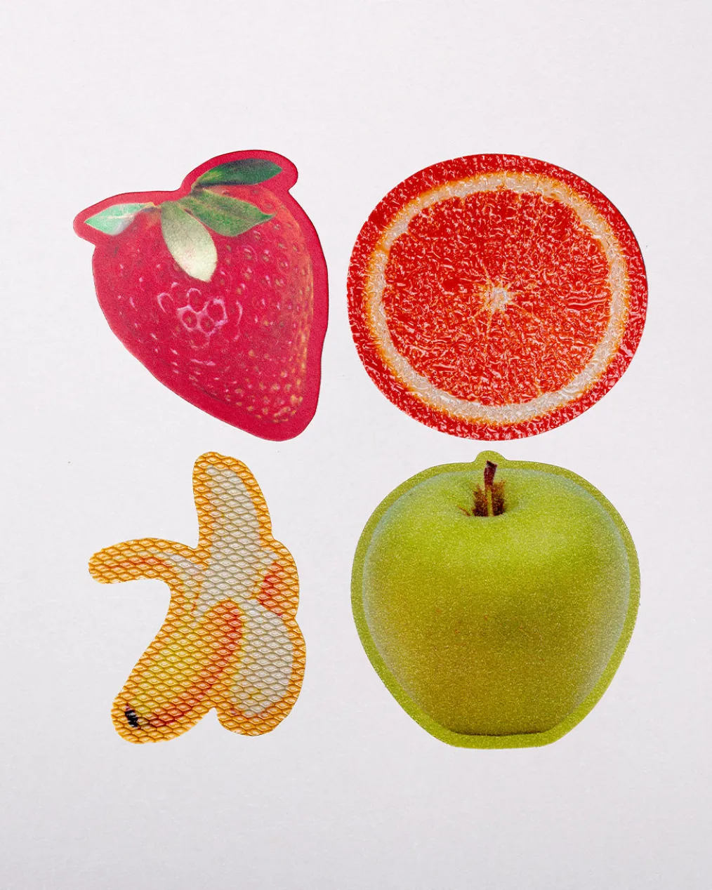 Stickers with superpowers. This set includes four unique fruit stickers with soothing textured surfaces.