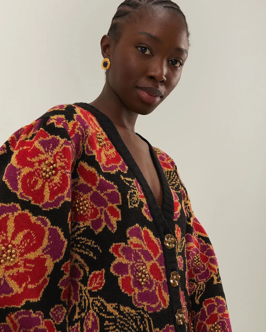 Embrace the vibrant essence of Brazil with the Shiny Chita Knit Cardigan by FARM Rio. This captivating piece is adorned with an intricate embroidery of lush florals in a kaleidoscope of reds, pinks, and golden hues, all set against a deep black background. The relaxed fit and contrasting textures deliver a cozy, yet refined look. Crafted with care from responsibly sourced materials, this cardigan is as thoughtful to the environment as it is stylish. Elevate your wardrobe with this stunning, artisanal creation that’s perfect for any occasion.