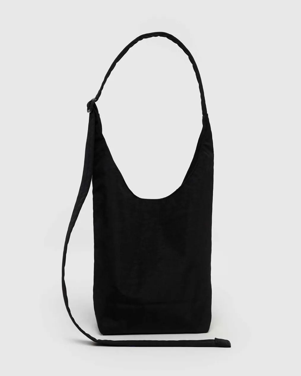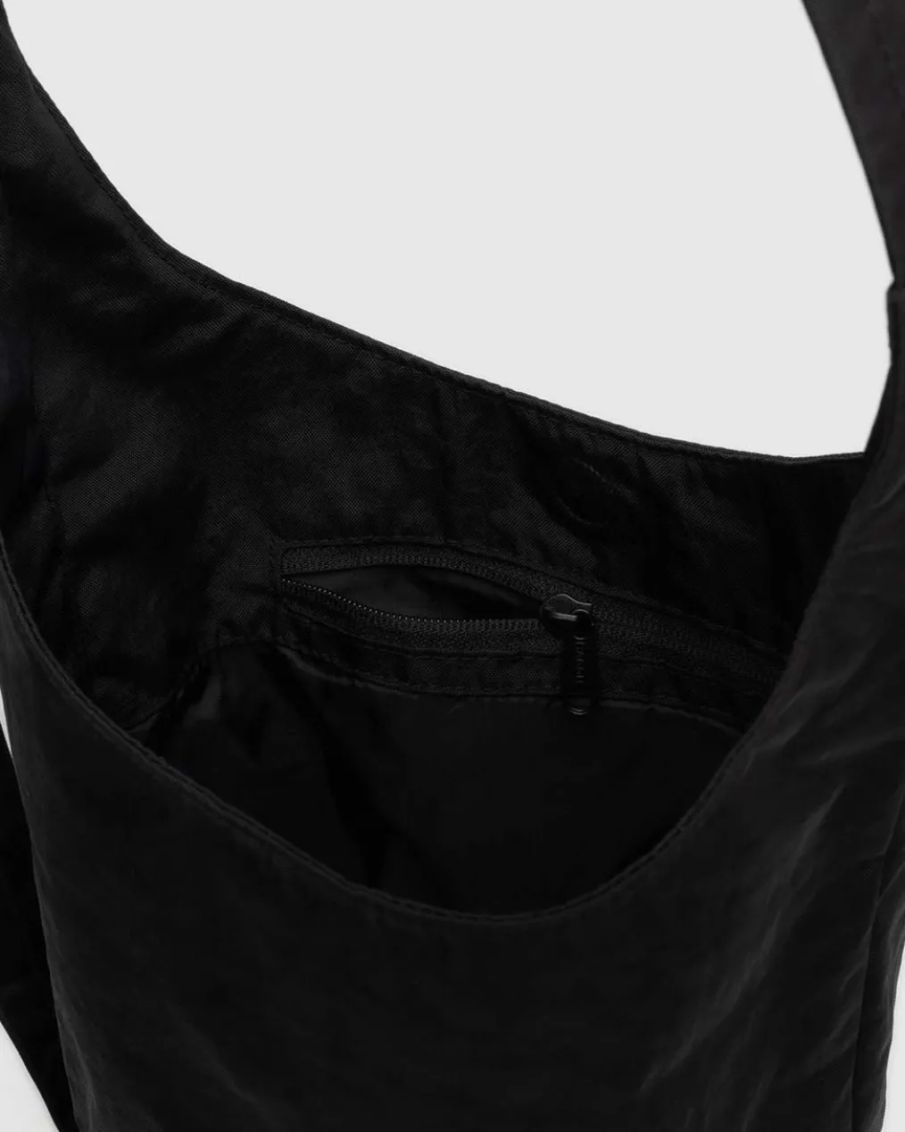 A slouchy, softly structured nylon bag with an adjustable strap. Interior zip pocket with a magnetic closure.