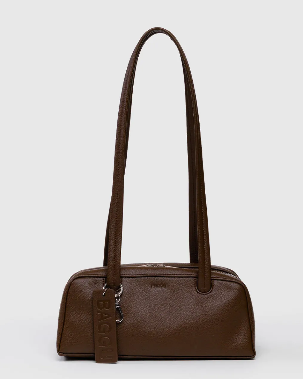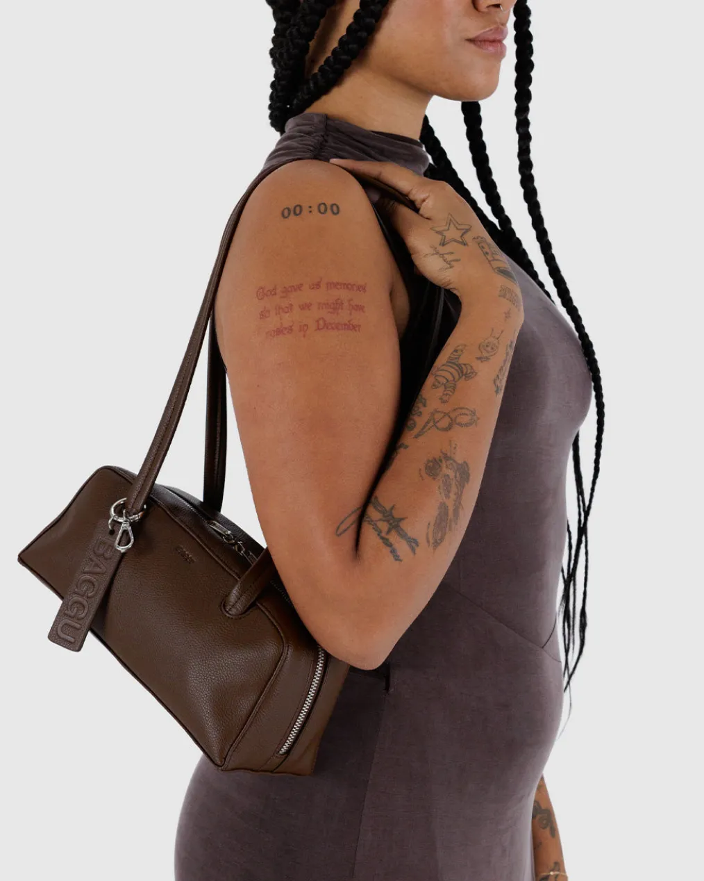 A small recycled leather bowler bag designed to be accessorized, with four charm loops and a clip ring. An interior zip pocket keeps things secure and in reach. Fits your phone, wallet, keys, and more.