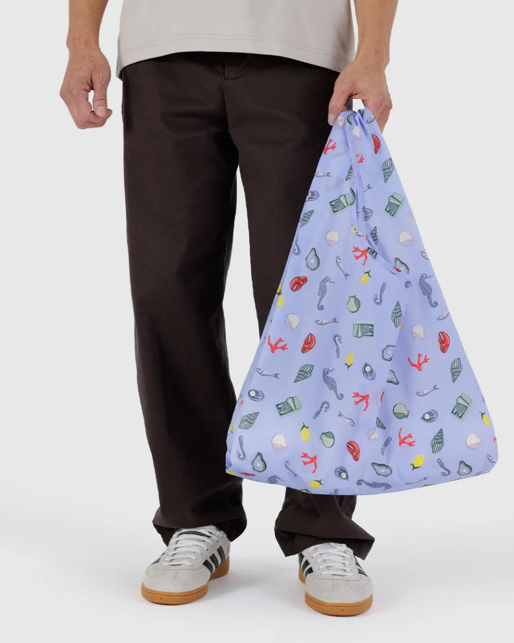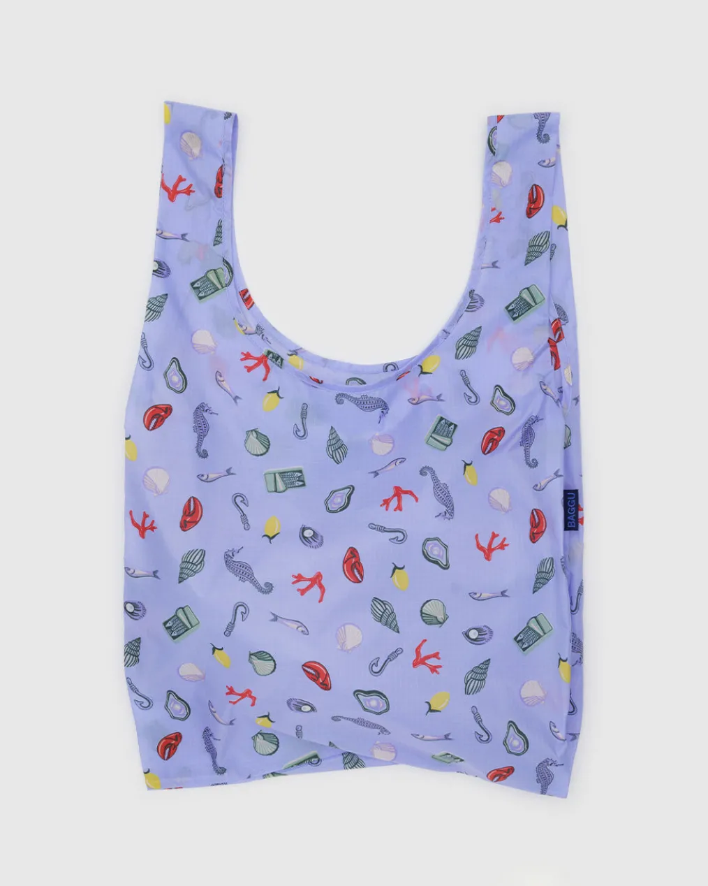Q: What is super lightweight, can hold 50 lbs., and has a fun print? A: This bag from Baggu! Seriously, it can hold fifty pounds. That’s like two and a half watermelons. (FYI: We looked that up. We didn’t know a watermelon’s weight offhand.)
