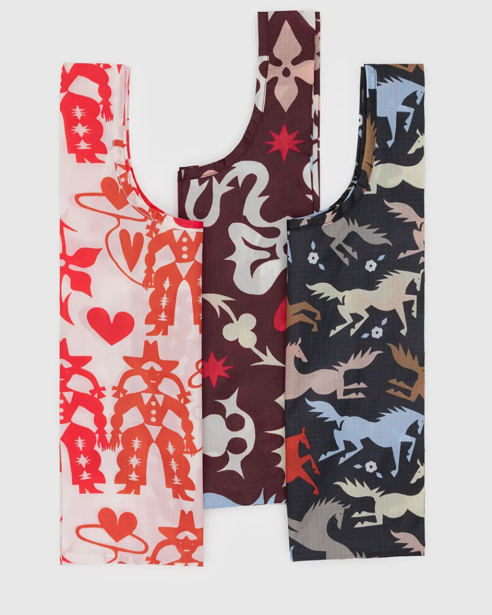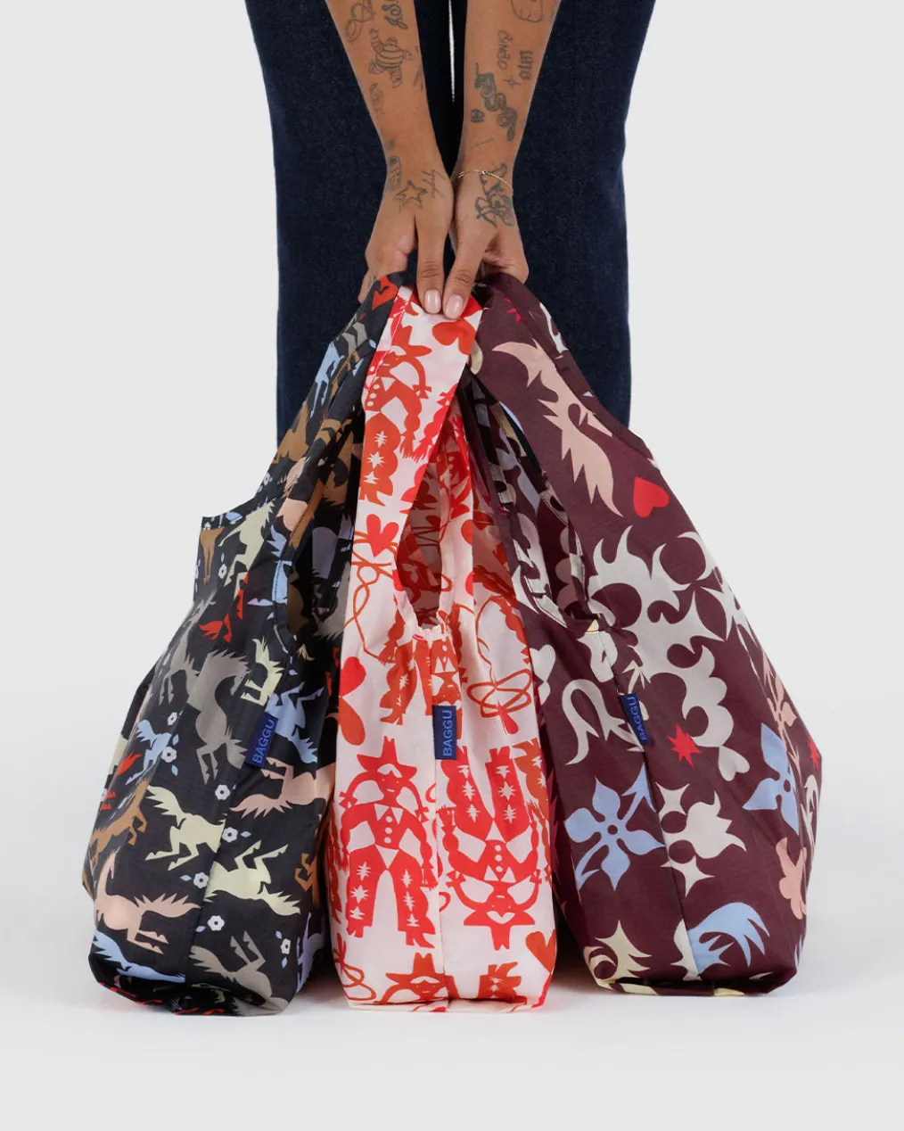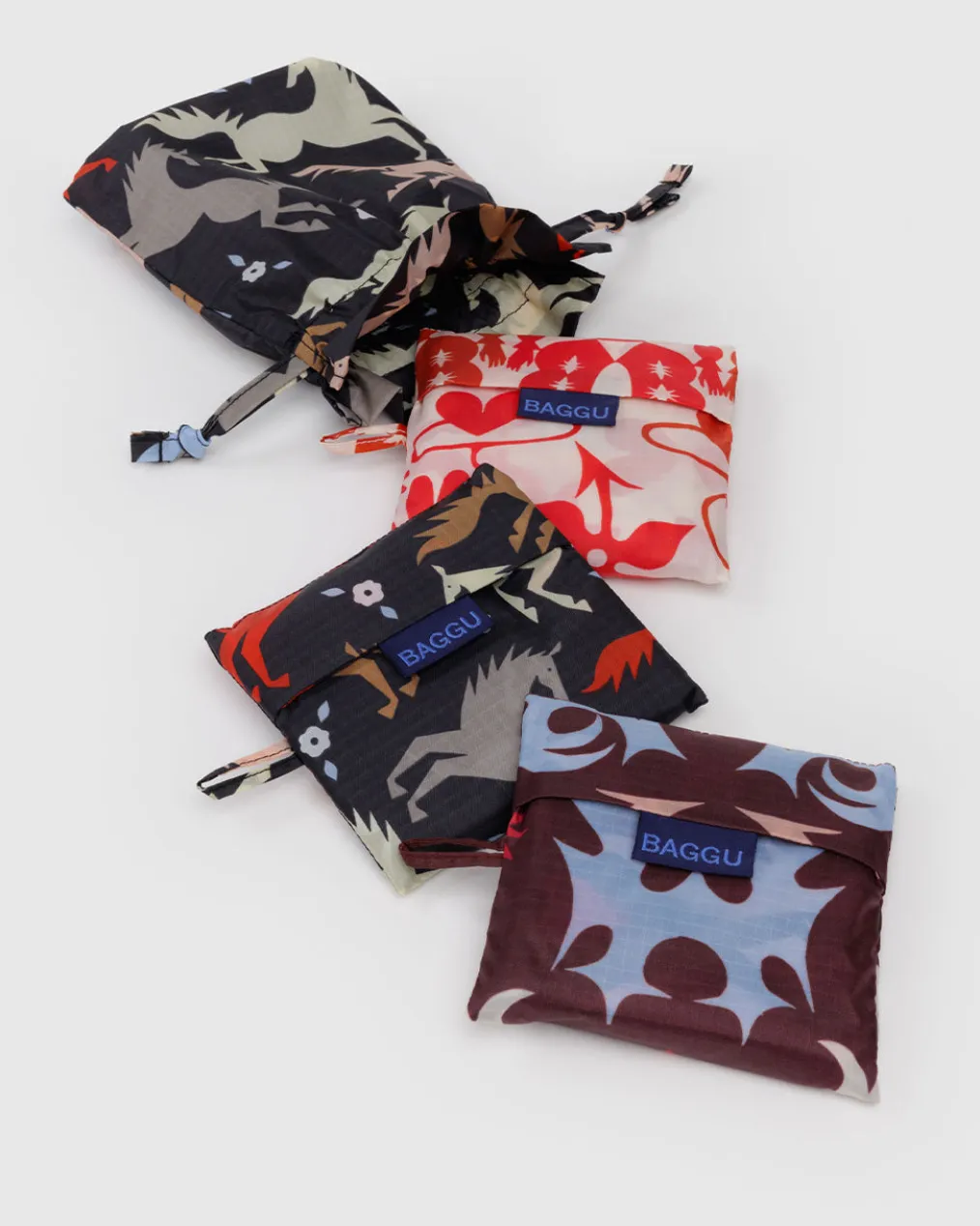 A set of Standard Baggus in a reusable drawstring pouch. Each set contains three unique prints, ideal for gifting.