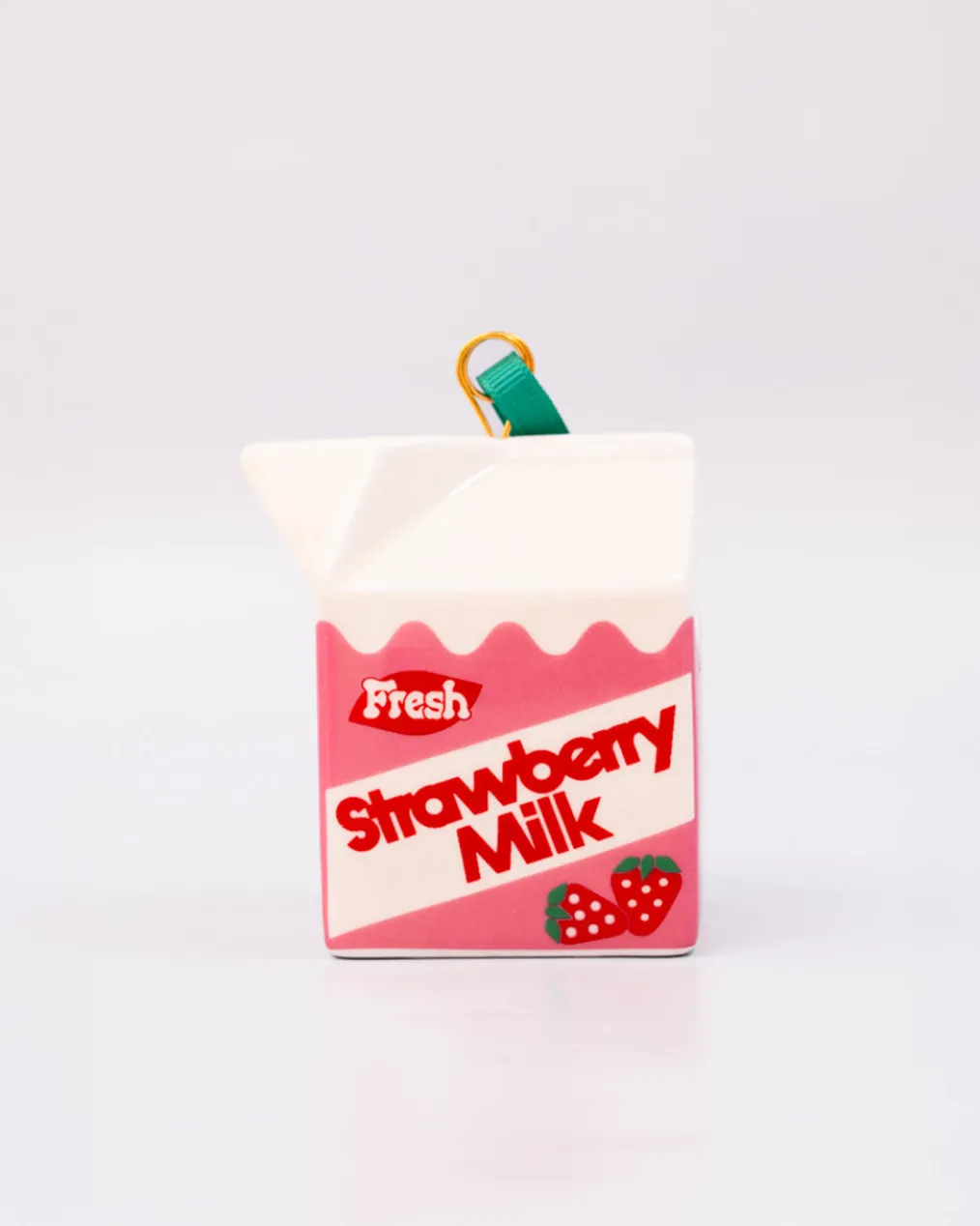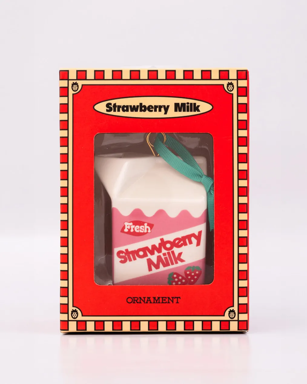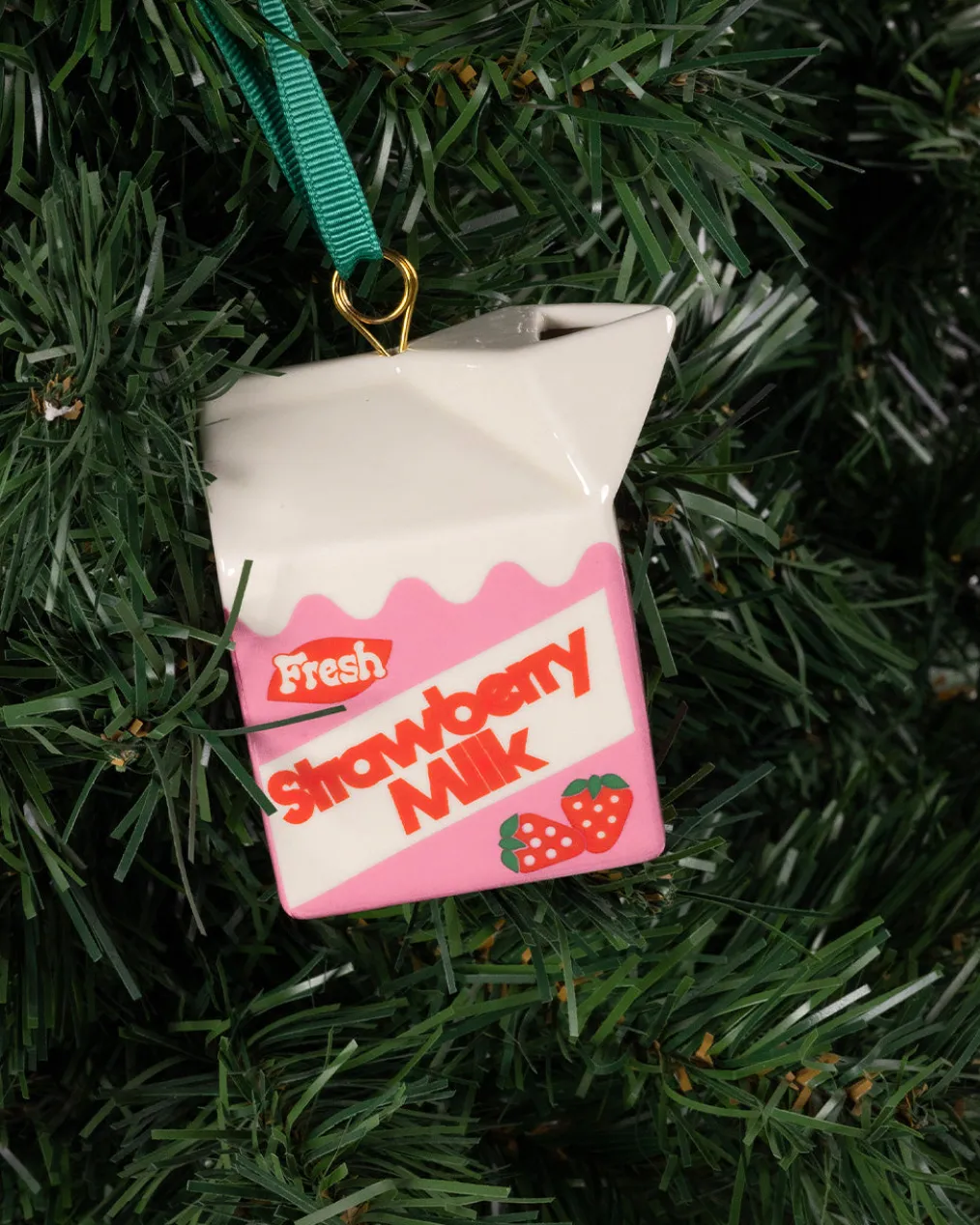 Gulp. A strawberry milk ornament. It’s made of ceramic and will look super cute on whatever tree branch or shelf you put it on.