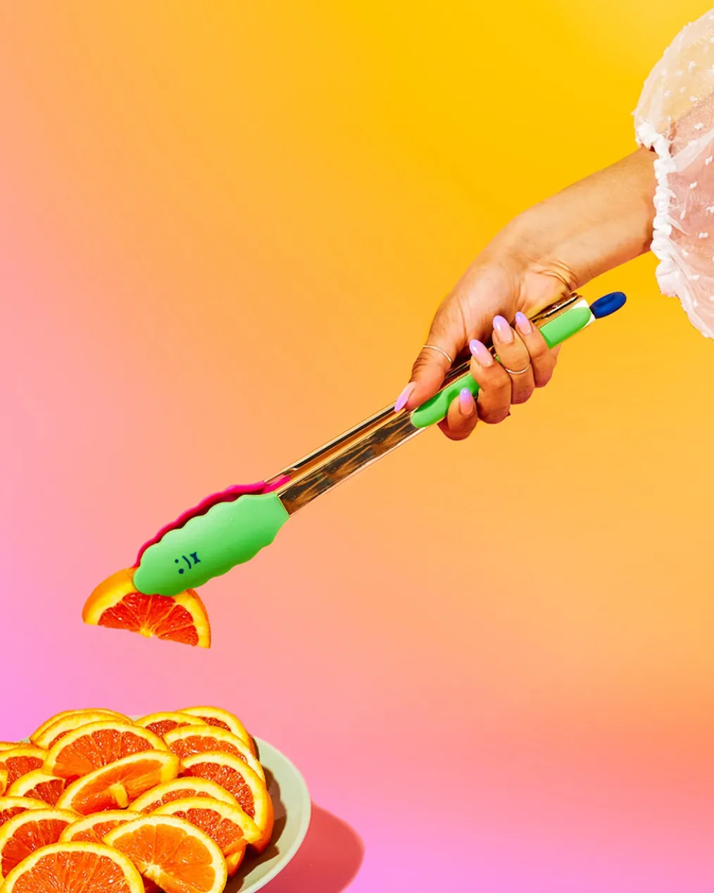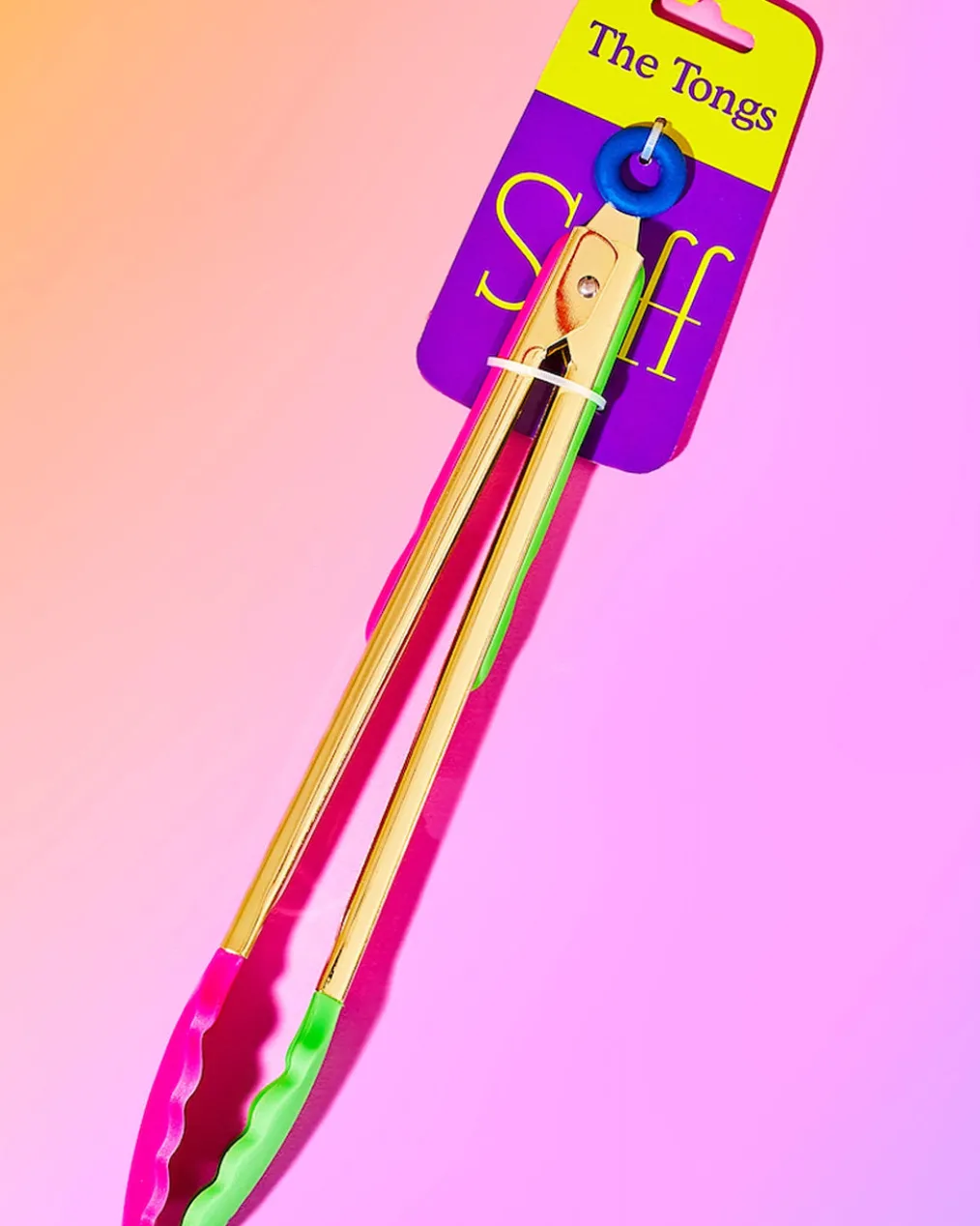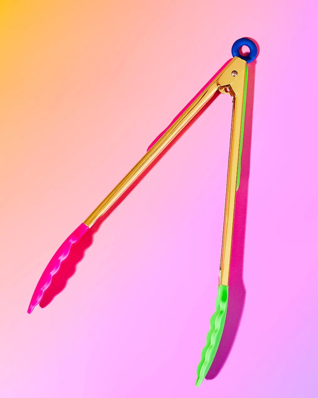 Brighten your kitchen with these sturdy multi-color tongs. One side has pink silicone grips, the other side has green silicone grips. Both sides have a golden stainlesssteel base and smiley faces eagerto lend you a hand. The push-pull ring locking mechanism is the blue cherry on top (or is it bottom)?