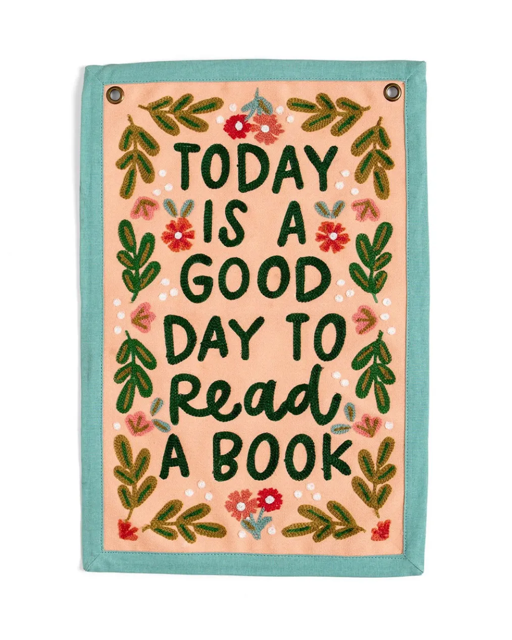 Enhance your reading space with othe Today Is A Good Day To Read a Book Embroidered Canvas Banner! Crafted with detailed chain-stitched embroidery on durable canvas, this banner radiates literary inspiration. Complete with brass grommets and a canvas hem edge, its effortless to display in a teacher’s classroom or a cozy home reading corner. Ideal for book lovers, educators, or anyone who loves literary decor, this banner makes a wonderful gift for birthdays, teacher appreciation, or housewarmings. Invite the joy of reading into any environment with this charming and uplifting decoration!