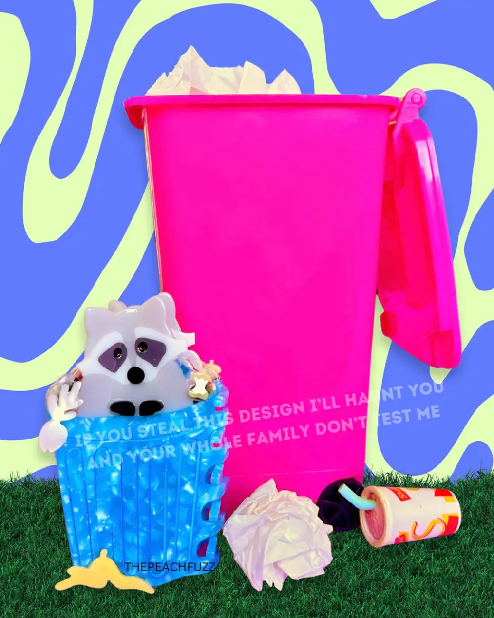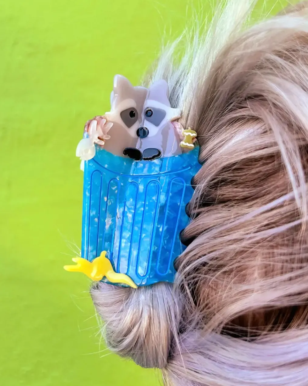 I’M THE TRASH MAN! And every trash man deserves their own trash panda. This raccoon inspired hair claw comes complete with a little guy in his cozy trash can and all his favorite scraps.