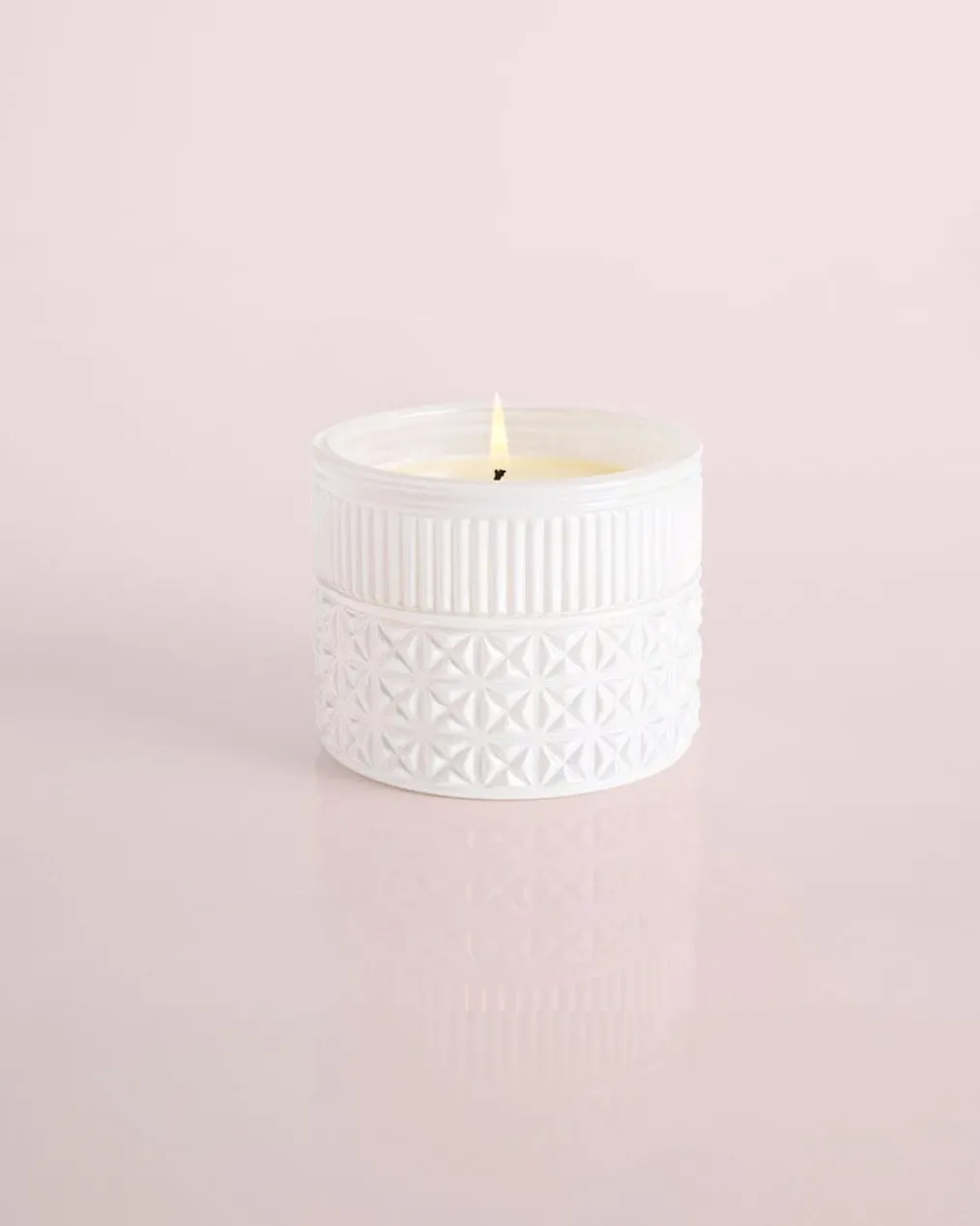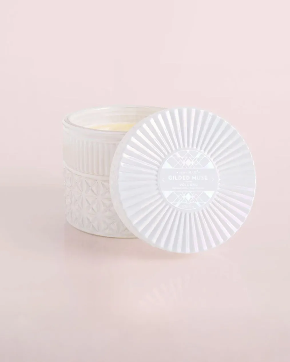 The White Opal Gilded Faceted Jar is the perfect match to any space with its iridescent, detailed finish and the iconicVolcanofragrance of tropical fruits and sugared citrus.