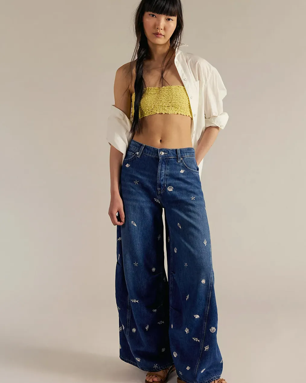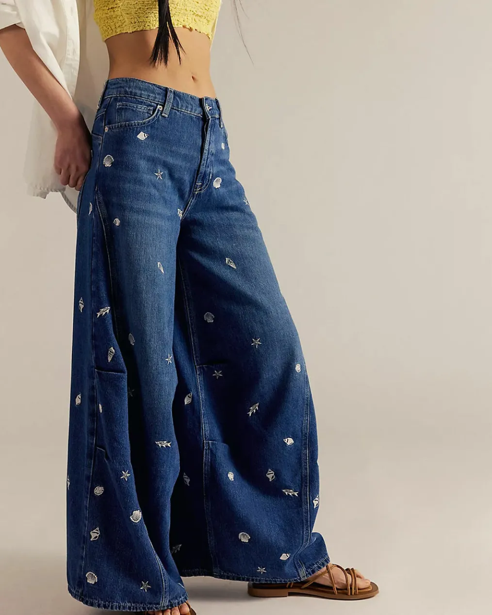 - Button fly closure, five-pocket design, tucked pleating at the knees, premium soft drapey denim, nautical embroidery throughout