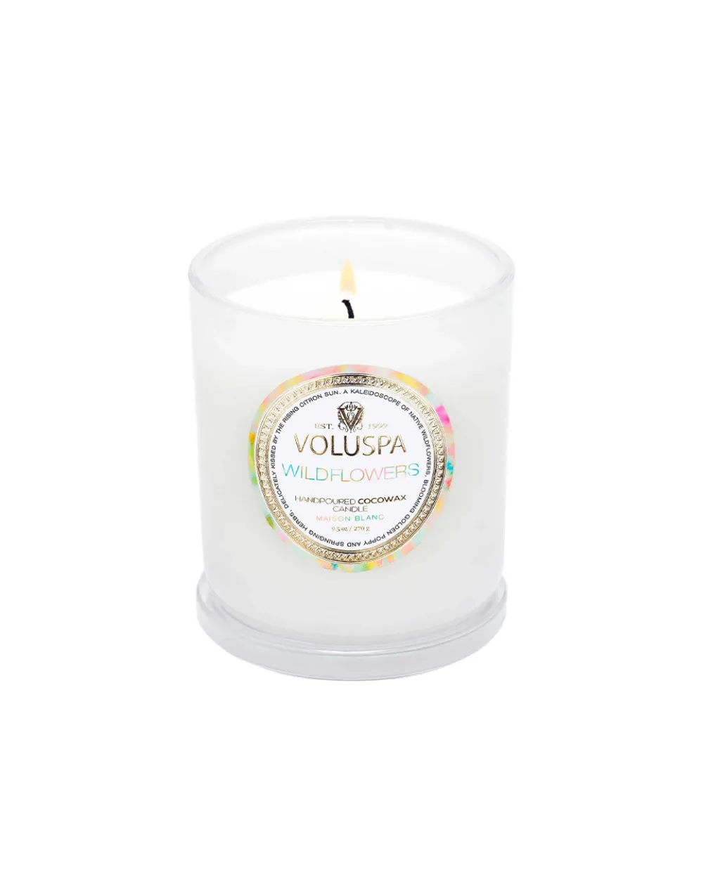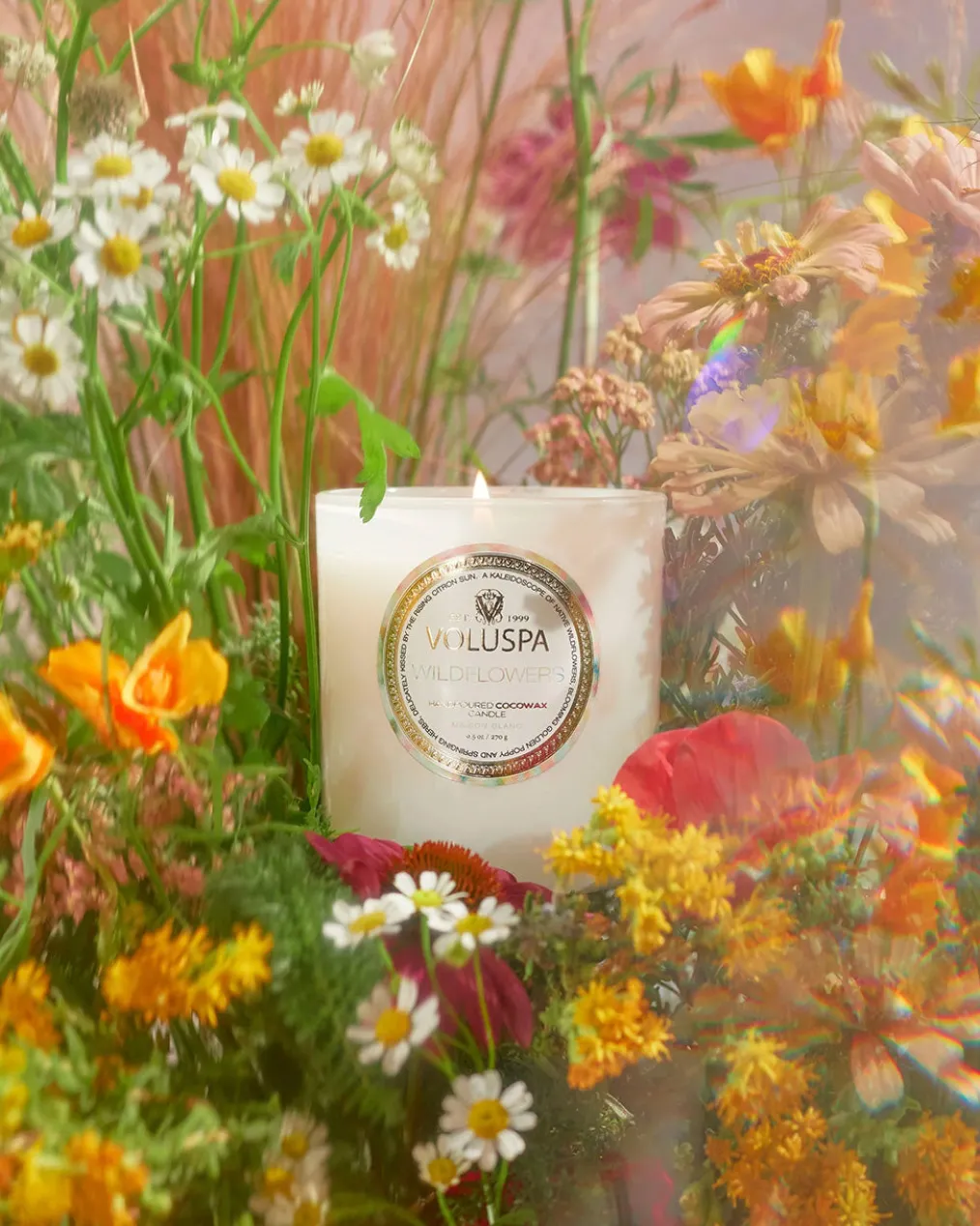 You’ve been called to dance among the wildflowers, losing yourself in the beauty of this unruly floral sea. Lightly pass your hand over a kaleidoscope of Native Wildflowers, blooming Golden Poppy, Ambrosia and springing Herbs; sugared by misty vapors of Blue Agave and delicately kissed by the rising Citron sun. Gently coax this fragrant super bloom of Voluspas Wildflowers.